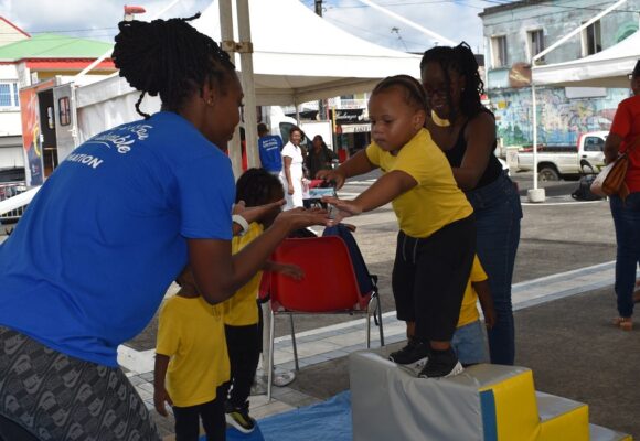 Dans l'atelier du saut dans le vide, un tout-petit expérimente l'équilibre entre peur et confiance, place Gerty Archimède, Morne-à-l’Eau, semaine de la petite enfance. Photo : Ville de Morne à l'eau