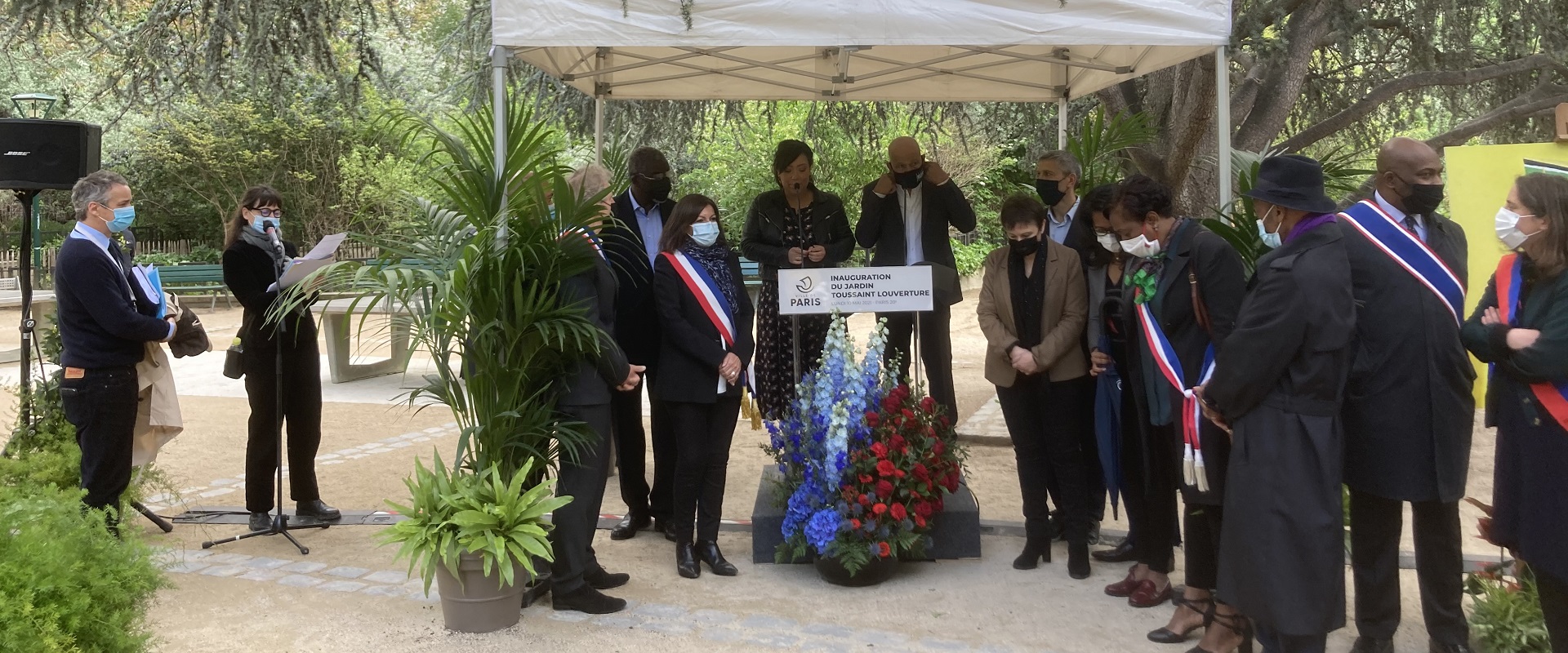 C’est en petit comité qu’Anne Hidalgo a inauguré, ce 10 mai en fin de matinée, le jardin Toussaint Louverture, au cœur du quartier des Amandiers, dans le XXème arrondissement de Paris. Etaient présents Josué Dahomey, ambassadeur d’Haïti en France, le président de la Fondation pour la mémoire de l’esclavage Jean-Marc Ayrault, ainsi qu’une trentaine de personnes, dont le conseiller d’Anne Hidalgo chargé des outre-mer Jacques Martial, Audrey Pulvar, tête de la liste PS aux régionales en Ile-de-France en juin prochain, et Lamia El Aaraje, candidate PS à la succession de George Pau-Langevin à la législative partielle du XXème arrondissement de Paris, ces 30 mai et 6 juin. La cérémonie a débuté par la lecture d’un extrait de la pièce d’Edouard Glissant ” Monsieur Toussaint “, par les acteurs Greg Germain et Laëtitia Guédon. Eric Pliez, maire du XXème arrondissement et la maire de Paris ont ensuite tour à tour évoqué la figure de ce héros franco-haïtien, esclave affranchi d’abord appelé Toussaint de Bréda, qui gagna le nom de Louverture par sa hardiesse au combat. Devenu général sous la Convention, il participa au soulèvement contre l’esclavage jusqu’à gouverner Saint Domingue. Il y défendit l’abolition, écrivit une Constitution autonomiste, mais vaincu le 6 mai 1802, déporté puis emprisonné dans le Jura par Napoléon, il mourut en 1803, sans avoir connu l’indépendance de la République Haïtienne, proclamée le 1er janvier 1804.