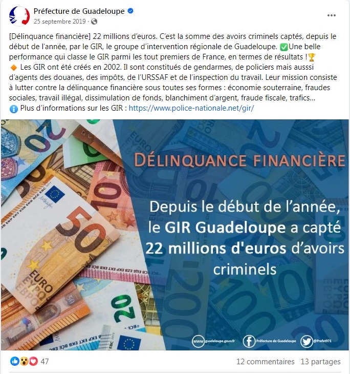 Les parquets de Guadeloupe indiquent avoir procédé en 2023 à des saisies d’avoirs criminels d’une valeur de 2 299 976,13 euros. Un chiffre lui aussi en baisse importante. En septembre 2019, la préfecture se félicitait de la « performance du groupe d’intervention régionale de Guadeloupe qui avait capté 22 millions d’avoirs criminels depuis le début de l’année ».