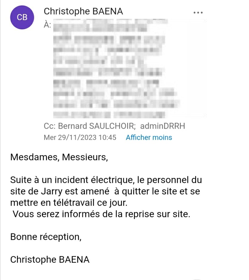 Les locaux de l’ER2C sont évacués depuis le 29 novembre. Ce jour-là, à 10 h 45 Christophe Baena, un des responsables de Guadeloupe formation adresse par mail le message suivant à 19 agents : « Mesdames, Messieurs suite à un incident électrique, le personnel du site de Jarry est amené à quitter les lieux et se mettre en télétravail ce jour. Vous serez informés de la reprise sur site ».