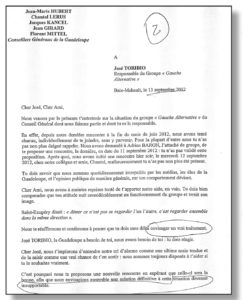 Un malheur n’arrive jamais seul. Pendant que le maire du Lamentin a fort à faire avec ses conseillers municipaux, il est dans le même temps rappelé à l’ordre par la gauche alternative dont il est en principe le patron. Avec une certaine affection mais fermement quand même, Jacques Kancel, Florent Mittel, Jean-Marie Hubert, et Adrien Baron dans une lettre où ils lui reprochent son mutisme voire son effacement, mettent l’accent sur son comportement et lui demande de « suivre un traitement ». Une manière à peine voilée de lui signifier qu’il est malade et qu’il doit se faire soigner. Voir fac similé d’un extrait de la lettre. Le coup est rude.