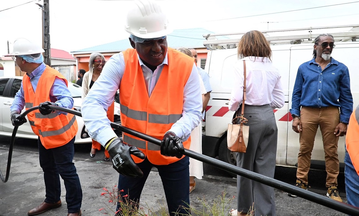 Guy Losbar, président du conseil départemental, mis en scène pour tirer un câble du réseau cuivré qui devient officiellement fermé ce 9 juillet 2025 sur le territoire de Petit-Bourg. Photo : FB conseil départemental.
