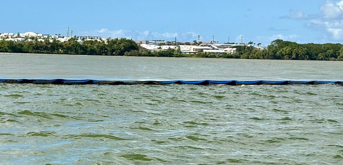 Au large d’Arnouville, entre Petit-Bourg et Baie-Mahault, le barrage déviant est de retour ce 27 janvier 2026. Photo: Préfecture de Guadeloupe