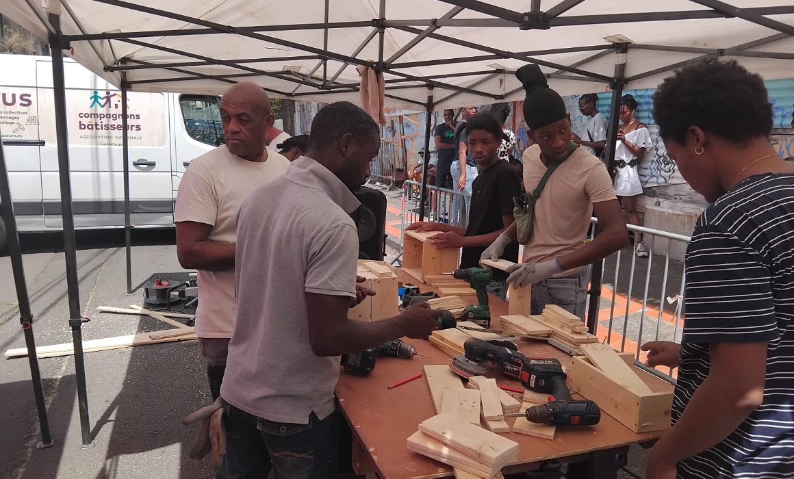 Le 17 mars à Bas-du-Bourg à Basse-Terre, sur l'établi du bricobus la fabrication de jardinières illustre les ateliers de mai destinés à remobiliser vers l'emploi pour des publics éloignés du marché du travail. Photo : Ville de Basse-Terre.