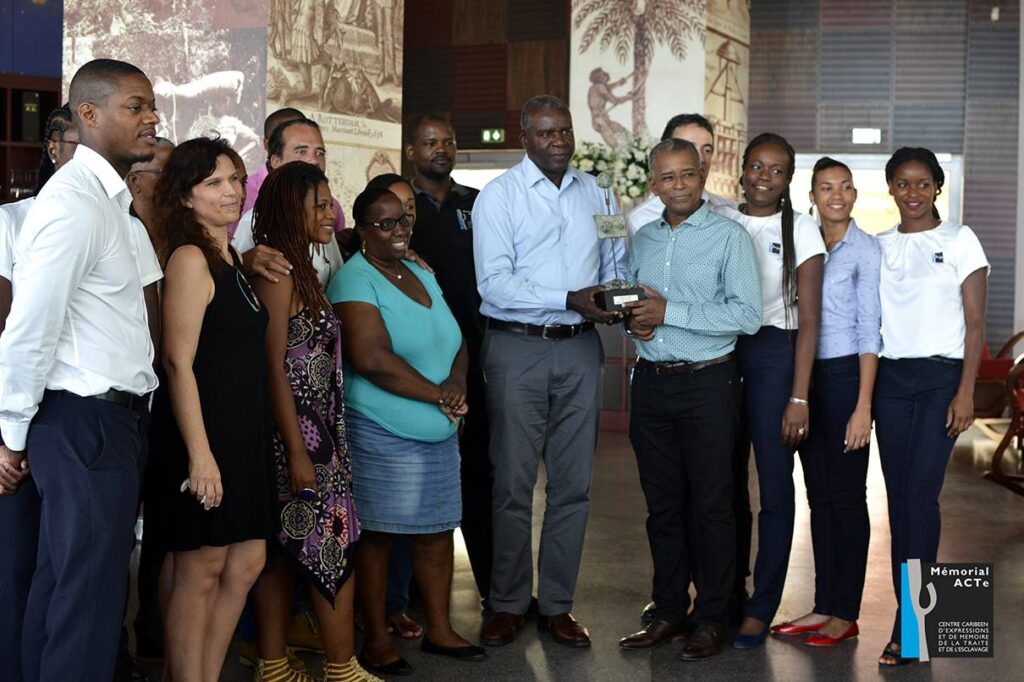 En avril 2018, Jacques Martial (à g.) et Georges Brédent, entourés de salariés, tiennent le trophée remporté par le Mémorial acte, désigné ‘Musée européen de l’année 2017’ par le Parlement européen. Photo : FB Mémorial ACTe