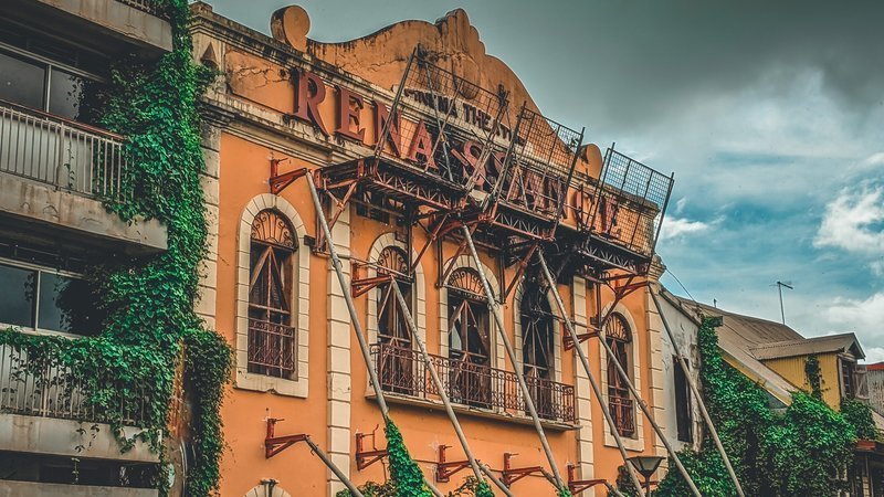 Place de la Victoire, Pointe-à-Pitre La façade du ciné-théâtre La Renaissance étayée suite à l'incendie et au défaut d'entretien du bâtiment.