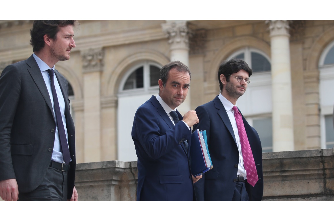 Le Premier ministre Sébastien Lecornu (C), escorté par ses conseillers, quitte le Palais Bourbon après le rejet des motions de censure contre son gouvernement, à Paris le 16 octobre 2025. Photo : J.E.E / Sipa