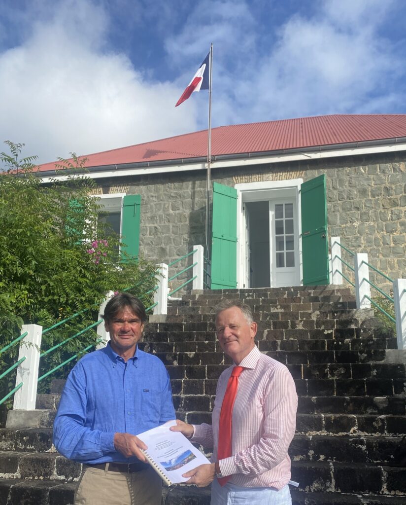 Vincent Berton (à droite), préfet délégué de Saint-Barthélemy et Saint-Martin, reçoit le rapport sur l’anticipation des effets du changement climatique à Saint-Barthélemy. Photo : Préfet de Saint-Barthélemy et de Saint-Martin