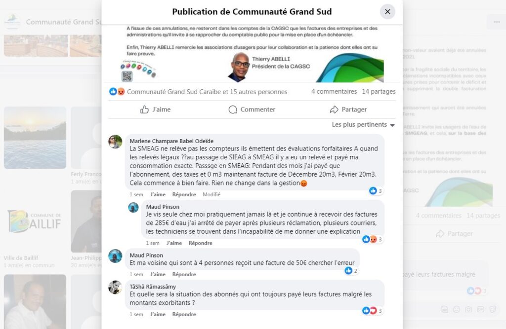 « Le SMGEAG ne relève pas les compteurs, ils émettent des évaluations forfaitaires. À quand les relevés légaux ?? Au passage de SIAEAG à SMGEAG il y a eu un relevé et payé ma consommation exacte. Passage en SMGEAG : Pendant des mois j’ai payé que l’abonnement, des taxes et 0 m3. Maintenant facture de décembre 20m3, février 20m3. Cela commence à bien faire. Rien ne change dans la gestion » témoigne une autre. « Et quelle sera la situation des abonnés qui ont toujours payé leurs factures malgré les montants exorbitants ? » interroge un autre le lendemain 6 mars.